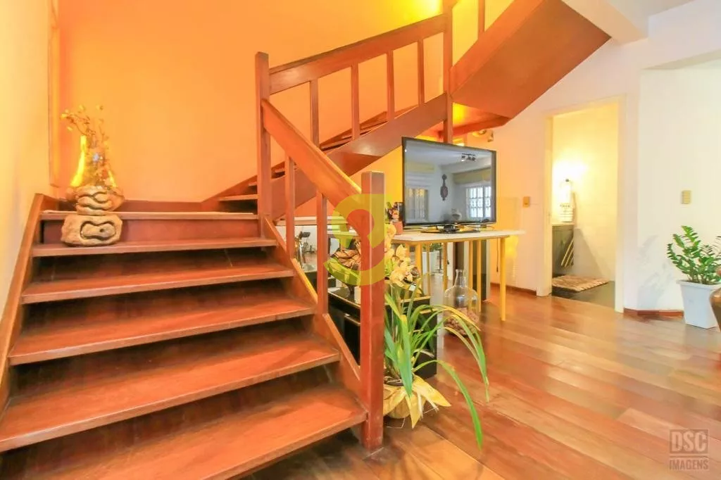 Excelente casa duplex residencial de 280 m² privativos, 3 dormitórios sendo 3 suítes (1 suíte master), living em 3 ambientes, 5 banheiros, lavanderia, espaço fitness, pátio com jardim e garagem com 4 vagas cobertas. Ficam somente os fixos.
