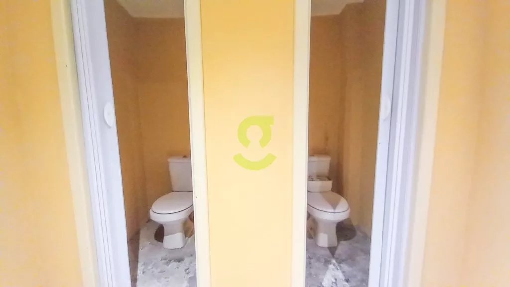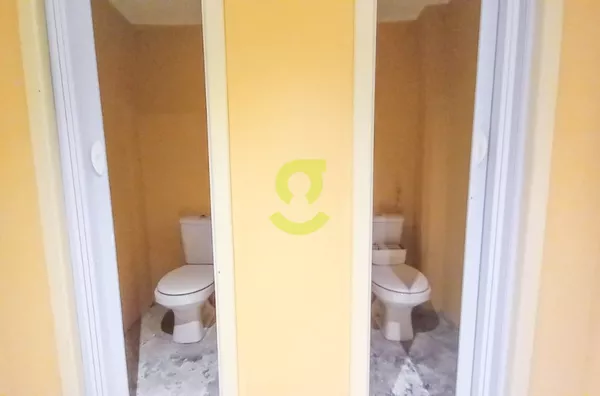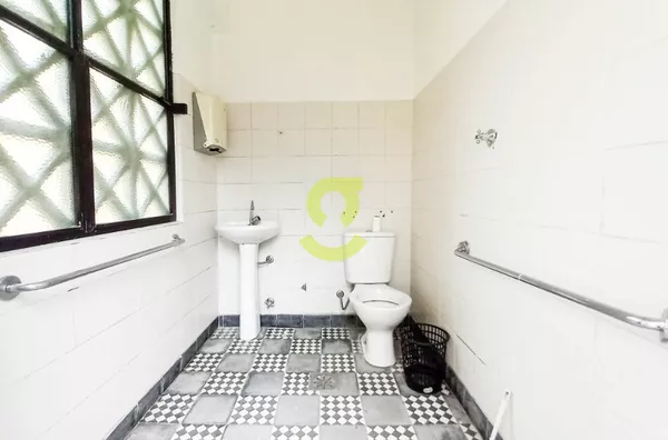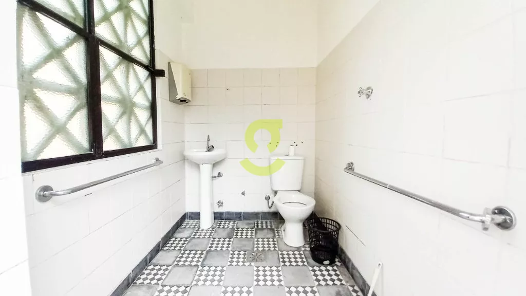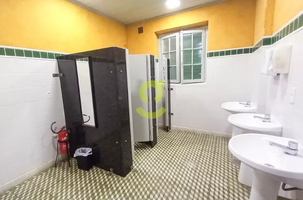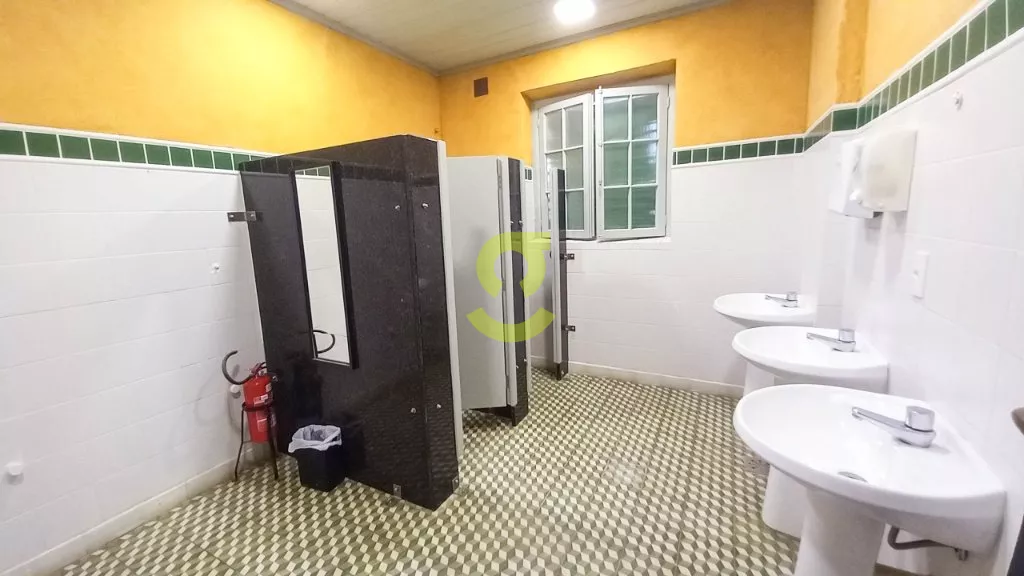 Mudando de ambiente temos um pequeno corredor, com dois banheiros, um feminino e um masculino, e em seguida as escadas que levam para o andar de baixo, onde encontramos outro cômodo, sendo uma área ampla em azulejos, e nesta área encontramos um pequeno cômodo podendo ser estoque ou almoxarifado, e um segundo ambiente sendo uma cozinha ou refeitório.