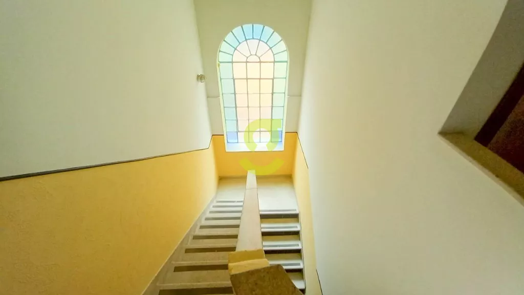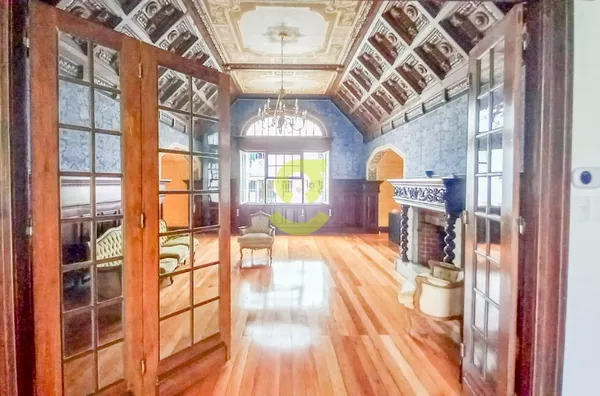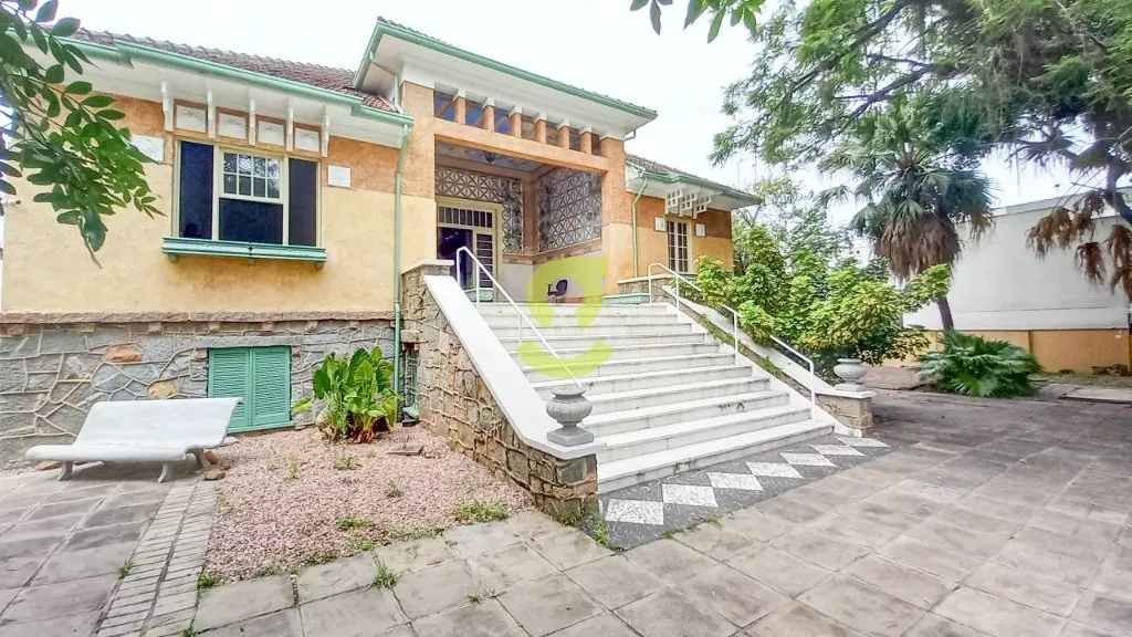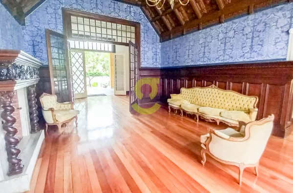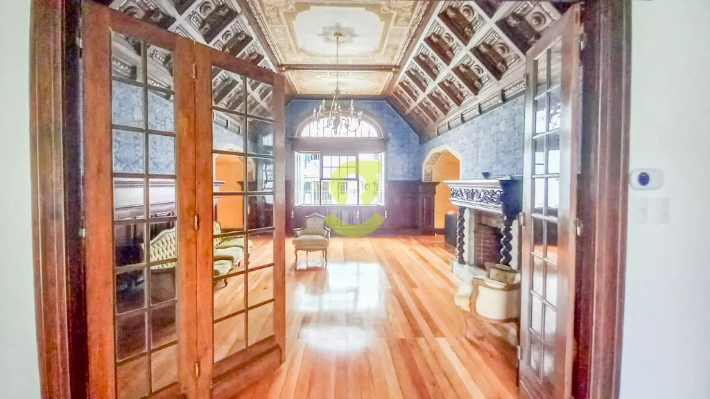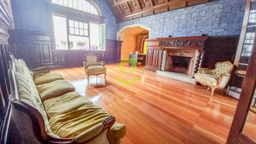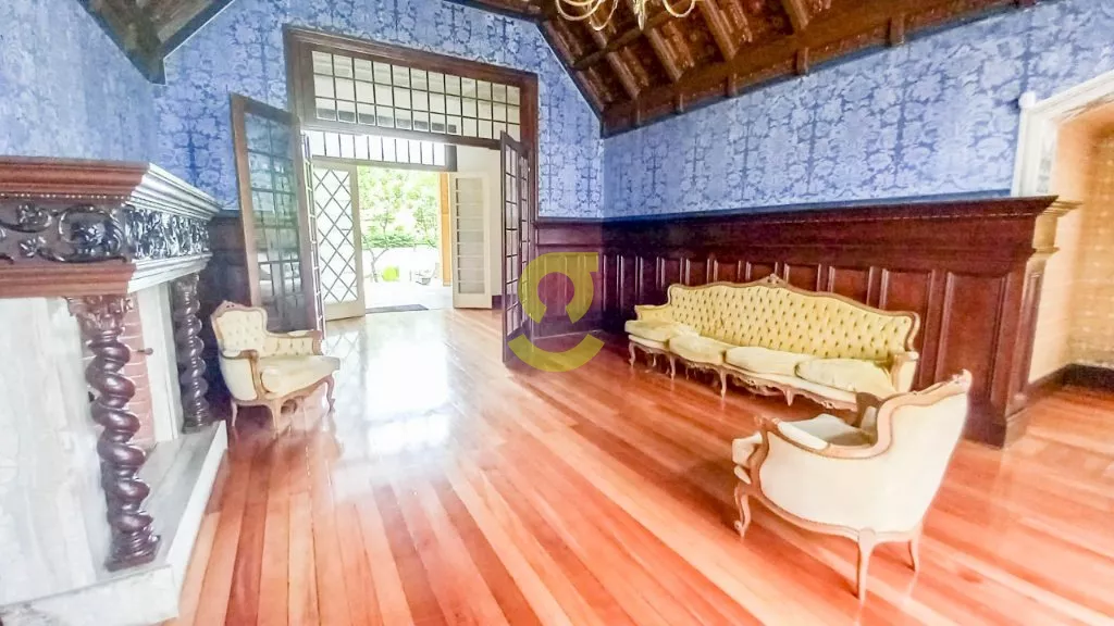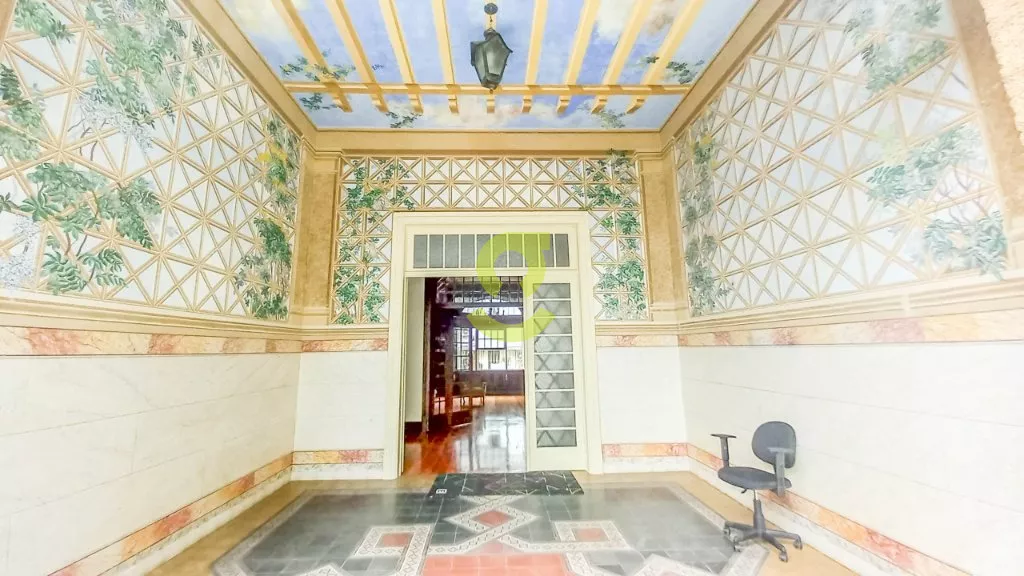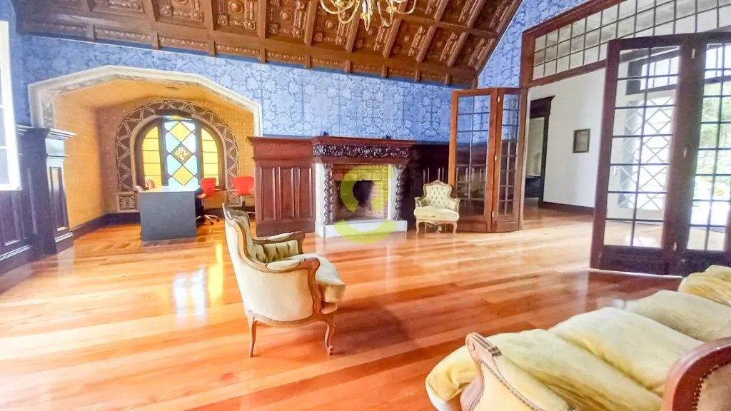 Entrando na casa uma bela escadaria, dando para o Hall de entrada em estilo português imperial, rico em detalhes, um salão principal único, amplo, com moveis de época reformados, teto catedral rico em detalhes e com um lustre deslumbrante, lareira original em madeira do século xx de arquitetura portuguesa, rica em detalhes únicos feitos a mão, paredes com detalhes em madeira nobre e tratada, dois espaços reservados no mesmo ambiente, com janelas estilo igrejas e catedrais, vidros em arte, e uma mesa com cadeiras para pequenas reuniões ou encontros, tudo reformado e impecável, mantendo luxuria e o glamour do século XX,