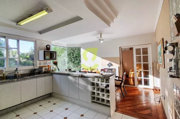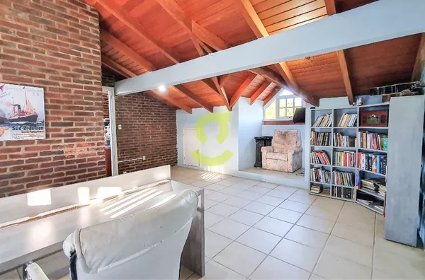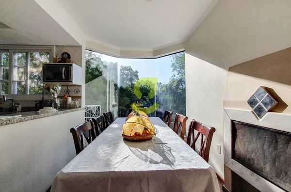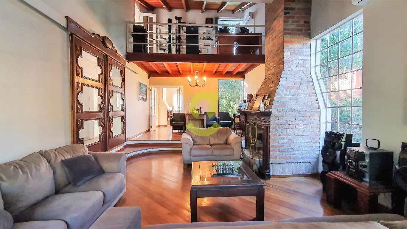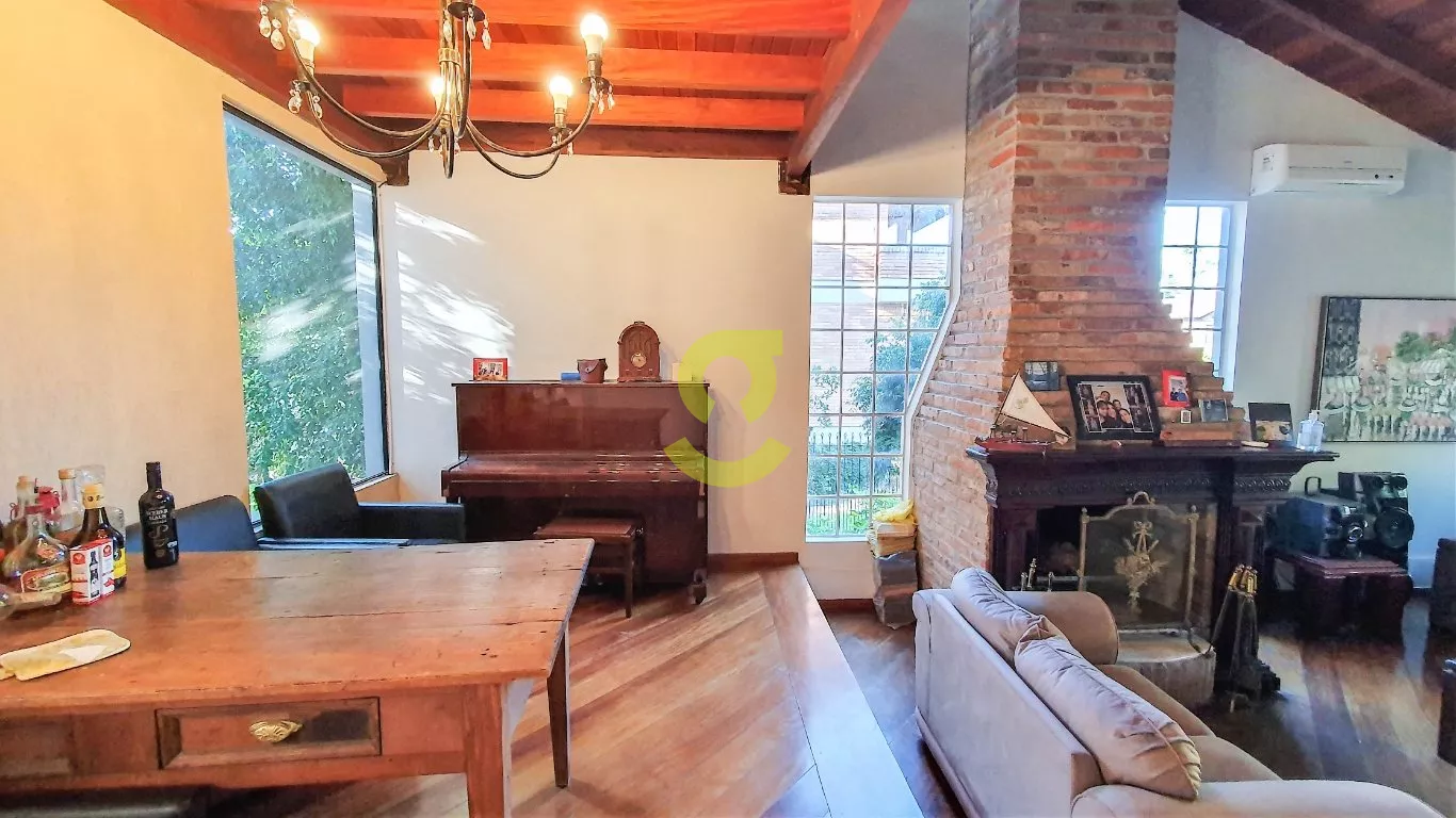 No primeiro piso na entrada da casa temos hall de entrada, lavabo, uma bela sala de estar com mezanino estilo rústico, com living de dois ambientes, ar-condicionado, lareira com madeira nobre e um lindo acabamento, uma segunda sala para televisão com lareira e ar-condicionado. Cozinha americana com vista panorâmica e lareira, dispensa com geladeira, lavanderia e área de serviço separada com sacada, e garagem coberta para até 2 carros.