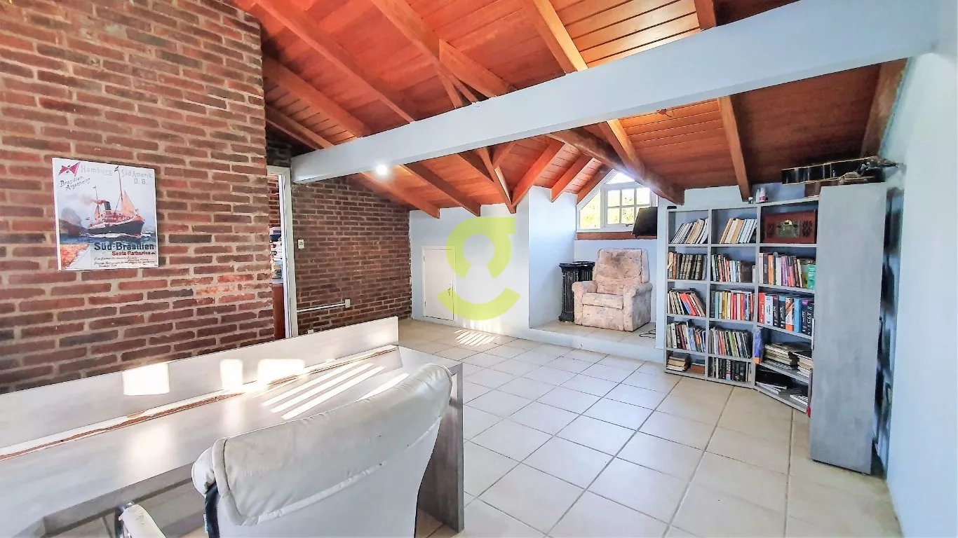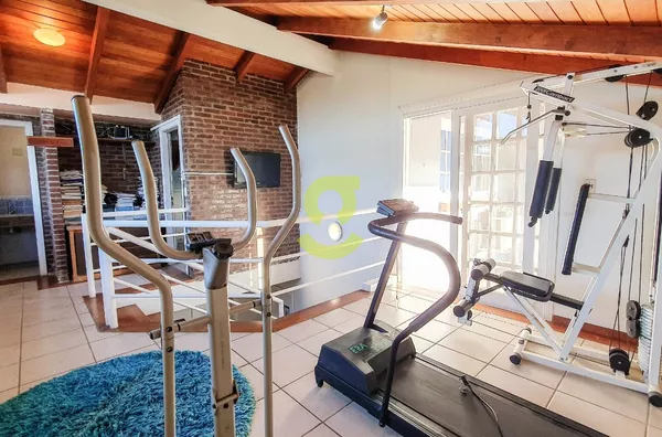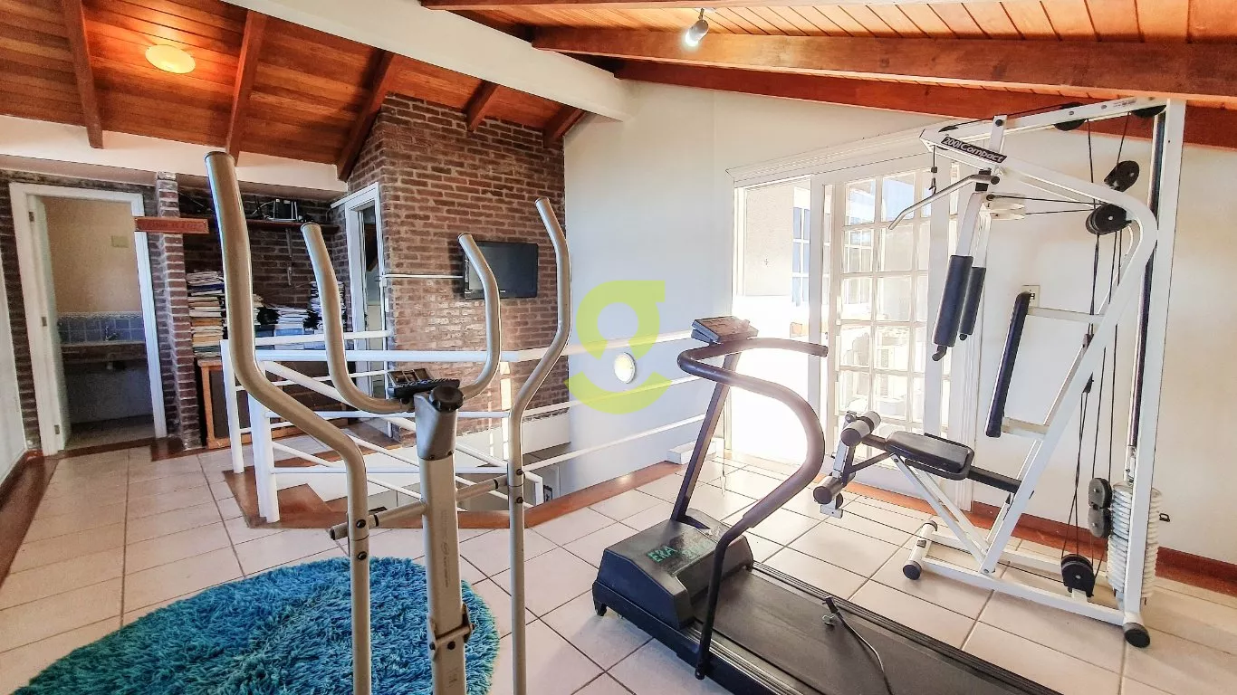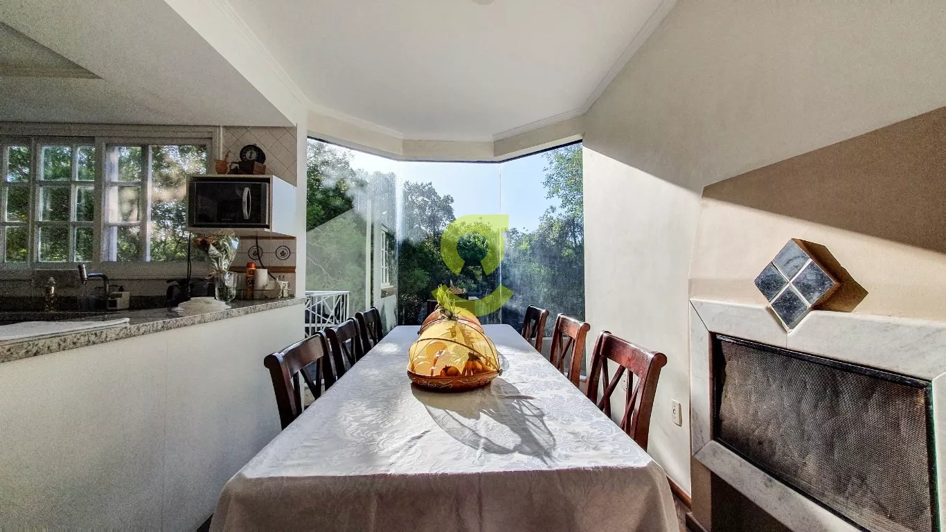 No primeiro piso na entrada da casa temos hall de entrada, lavabo, uma bela sala de estar com mezanino estilo rústico, com living de dois ambientes, ar-condicionado, lareira com madeira nobre e um lindo acabamento, uma segunda sala para televisão com lareira e ar-condicionado. Cozinha americana com vista panorâmica e lareira, dispensa com geladeira, lavanderia e área de serviço separada com sacada, e garagem coberta para até 2 carros.