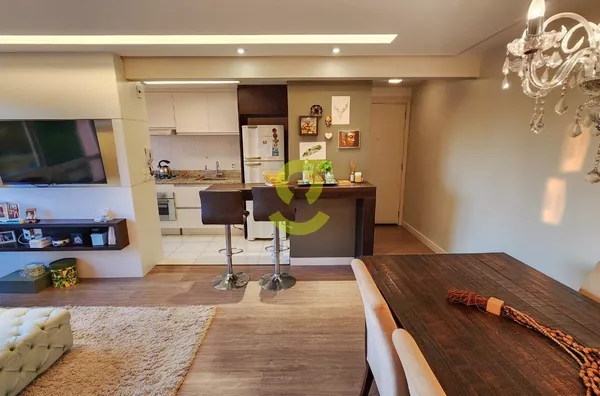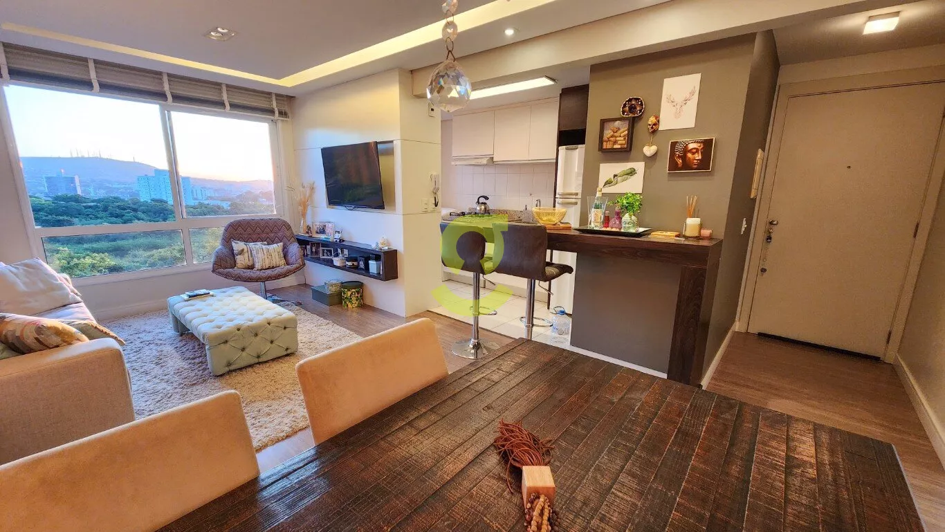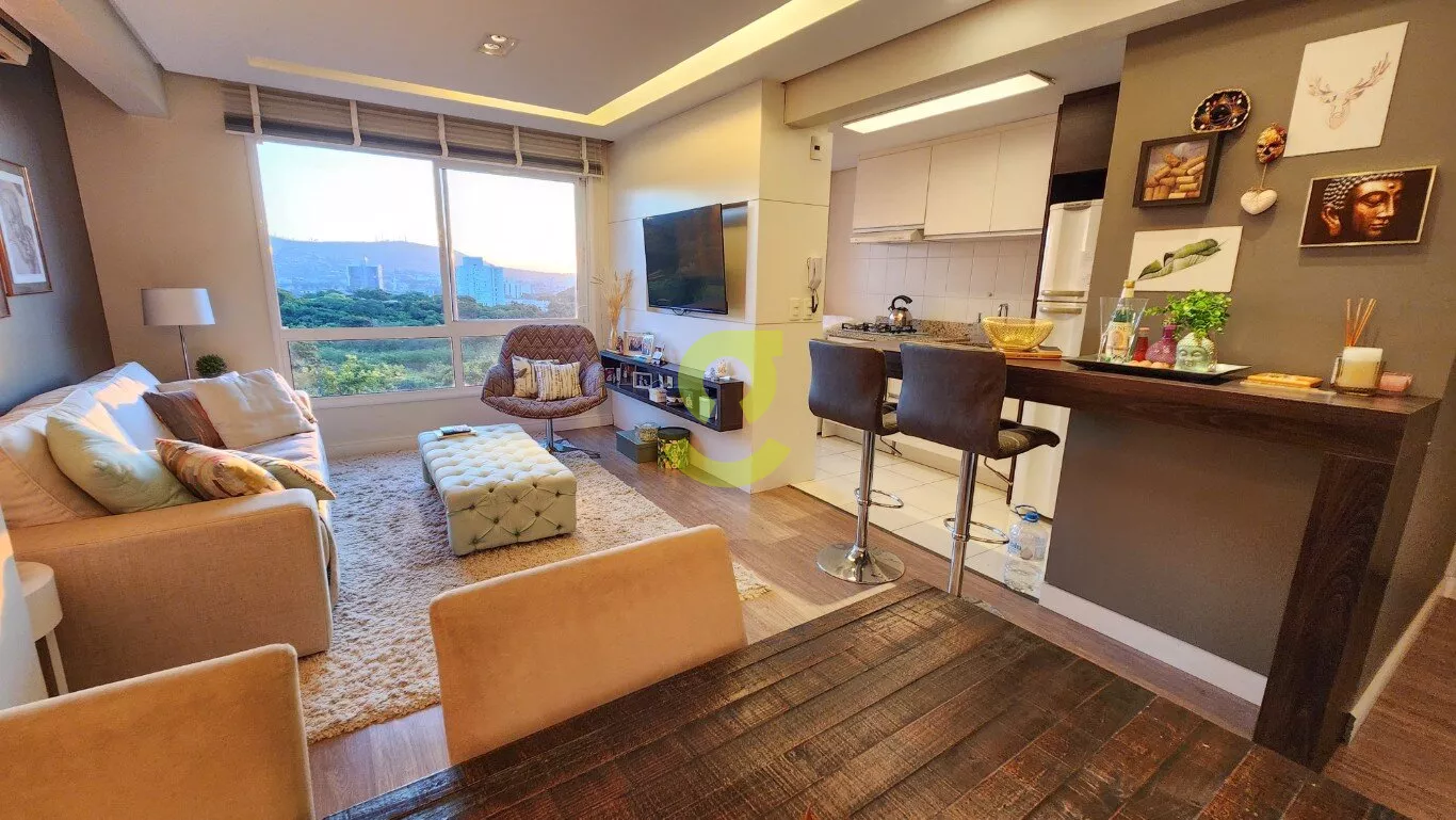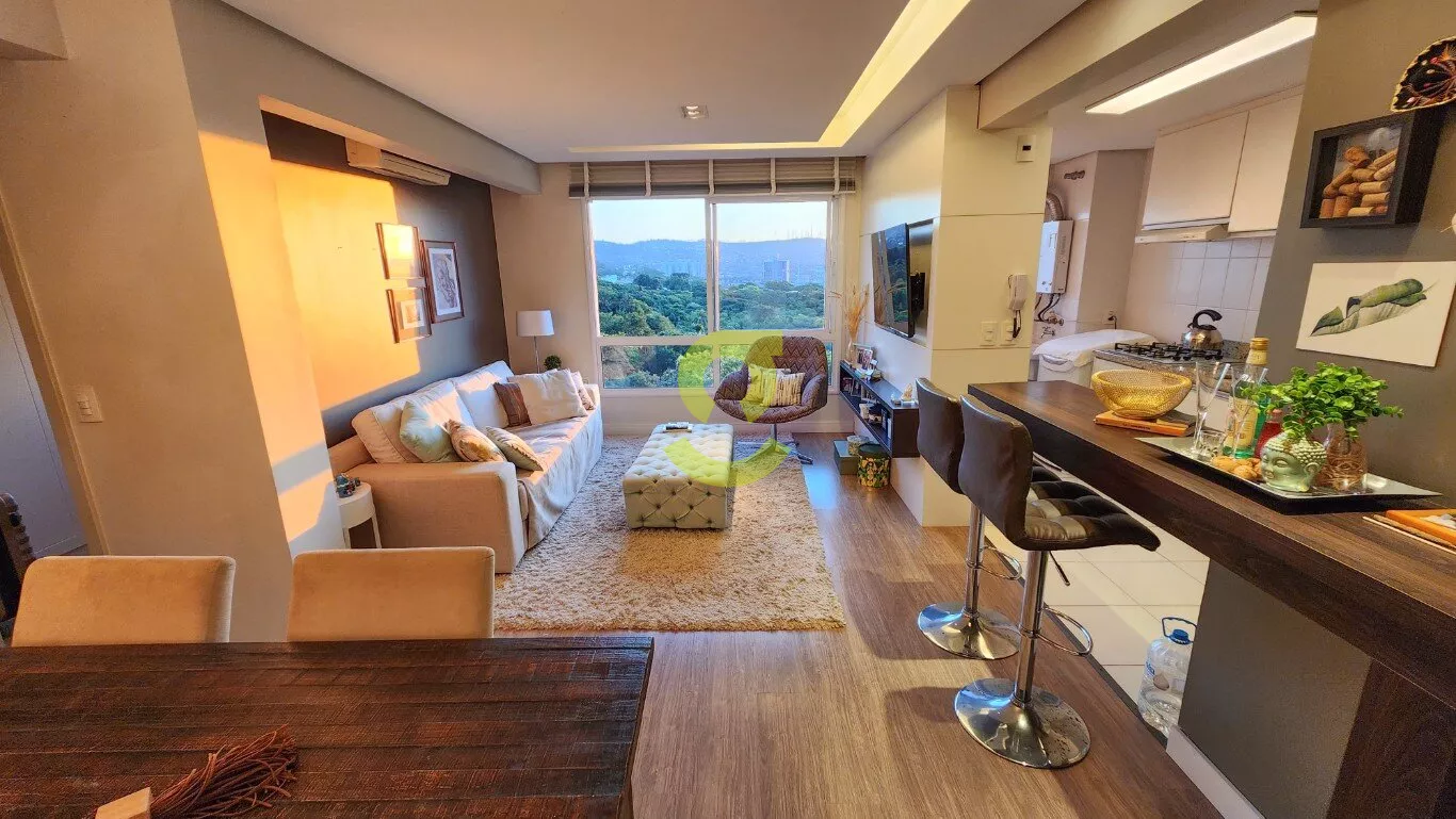 Ótimo apartamento MOBILIADO, 70m privativos, vista espetacular, living dois ambientes, cozinha americana com churrasqueira, 2 dormitórios sendo uma suite e vaga de garagem coberta! Condominio com infraestrutura completa de lazer, com portaria 24hs, 2 playground, salão de festa infantil, salão de festa adulto, sala de jogos, academia, piscina adulto e infantil, brinquedoteca, espaco pet, espaço zen, lan house, mercado, quadra poliesportiva, bicicletário, quiosque com churrasqueira, fogo de chão.