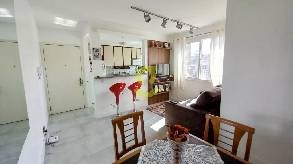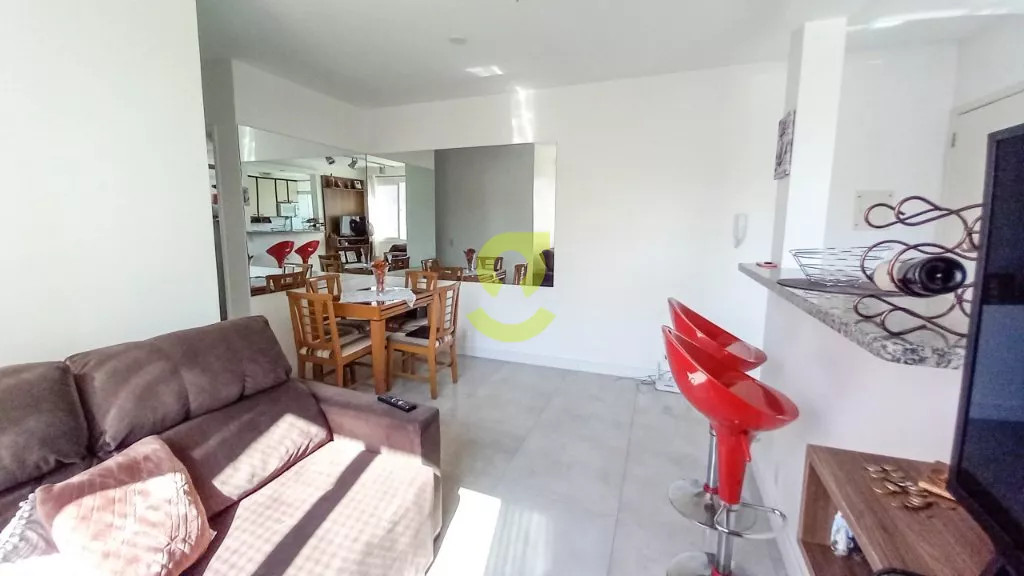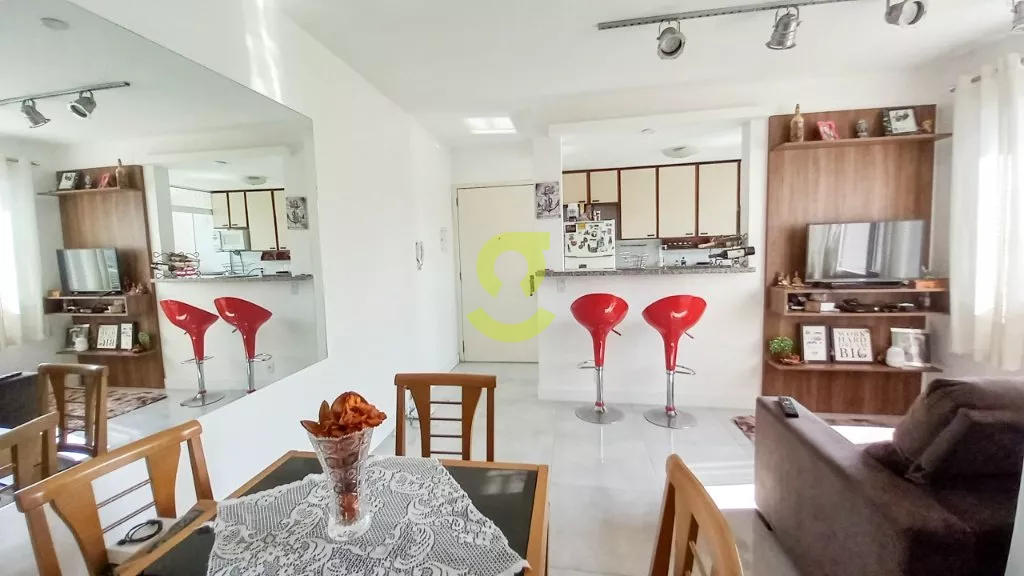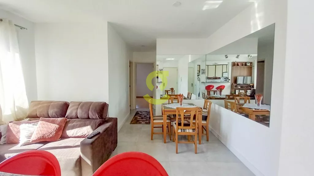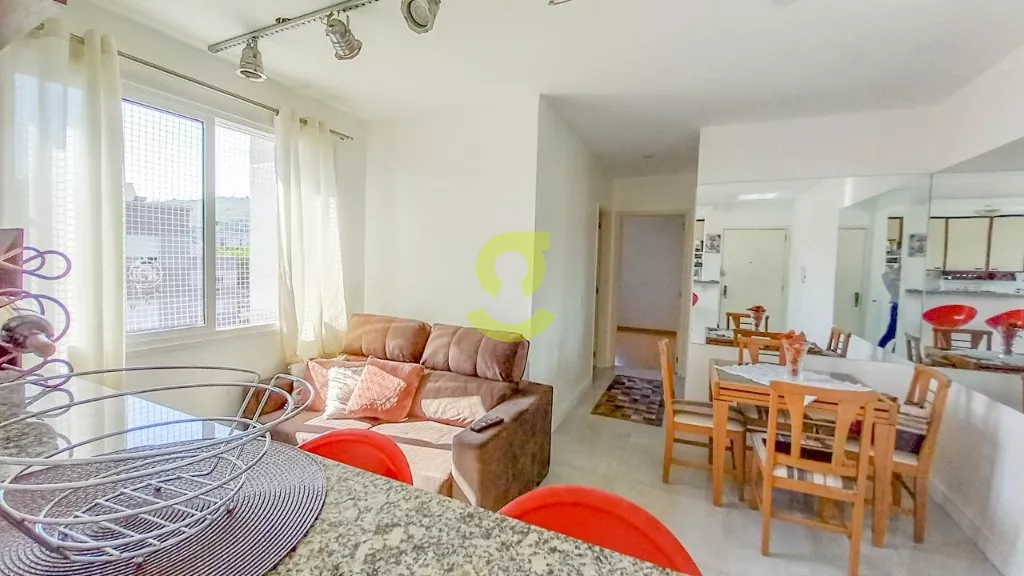 Este apartamento de 56m² dispõe de cozinha americana planejada com uma porta pequena de vidro de acesso, lavanderia, uma bela sala com living para dois ambientes com espelhos, um banheiro social, dois quartos, telas nas janelas e mobiliado, prontinho para morar, só arrumar as malas e vir.