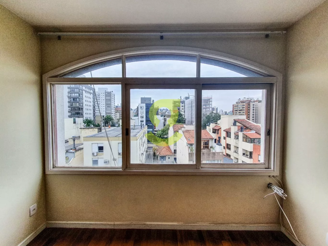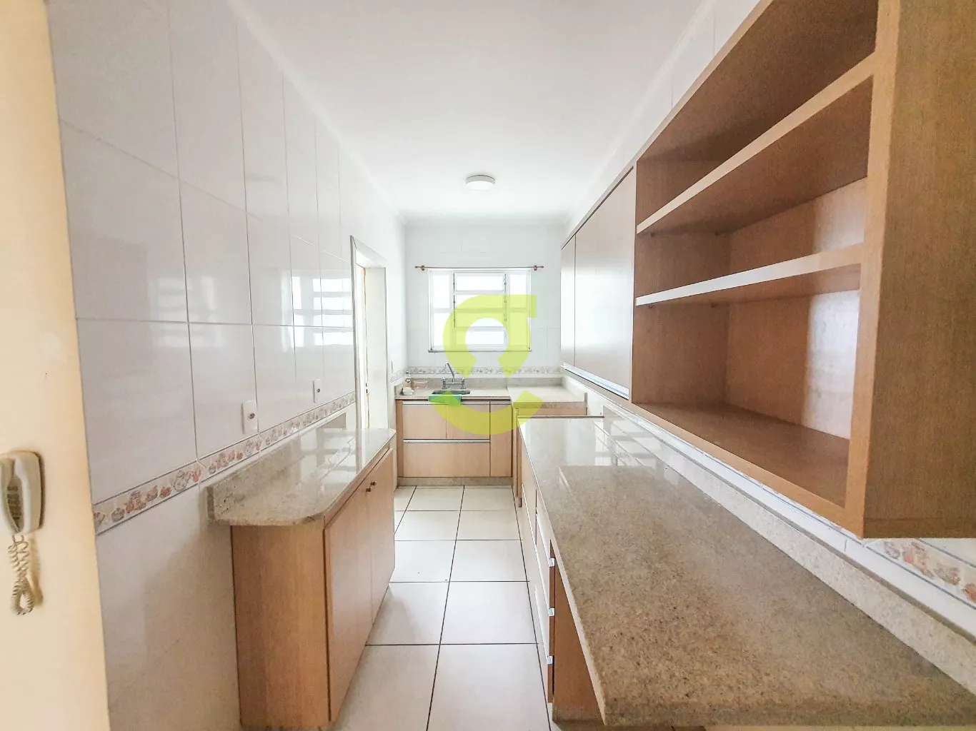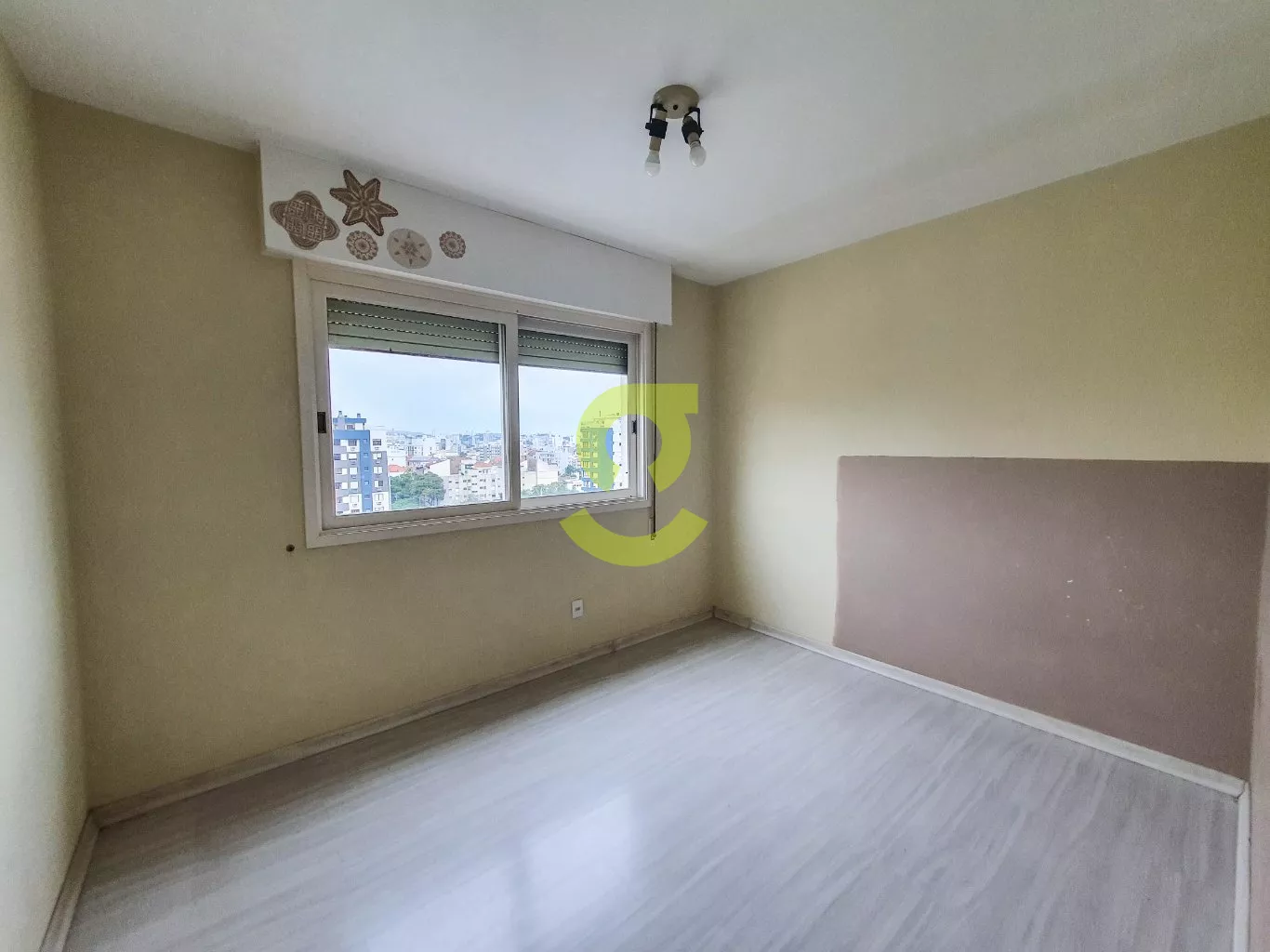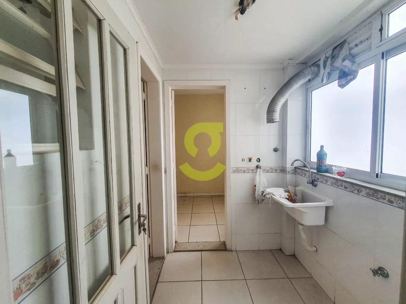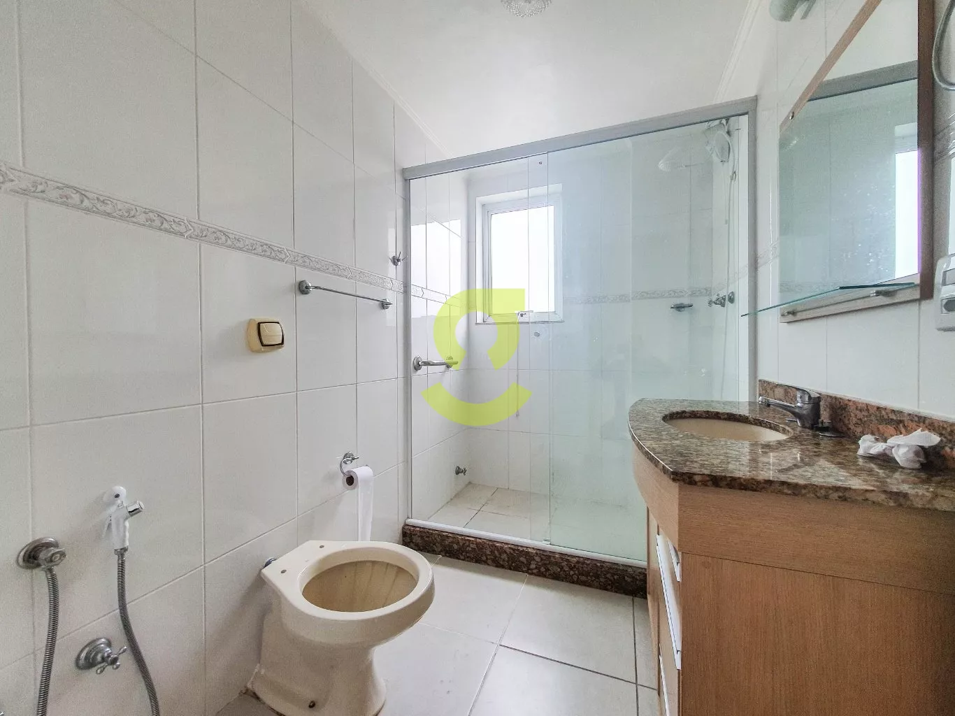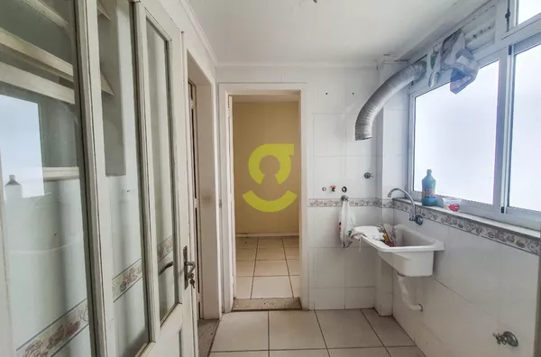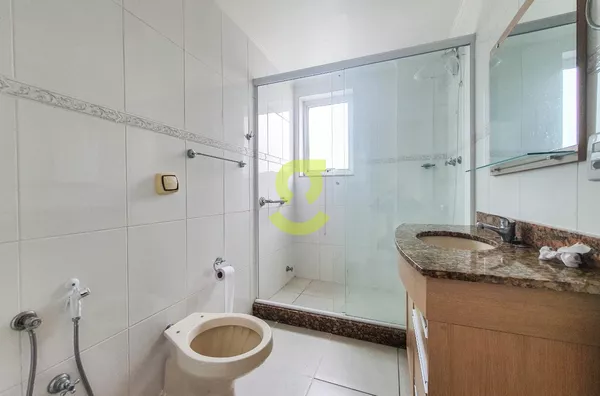 Apartamento de 82m², ampla janela na sala com uma bela vista, andar alto, cozinha com móveis fixos, área de serviço separada com dependência de empregada com banheiro social, 2 dormitórios e banheiro social com box de vidro entre os quartos.