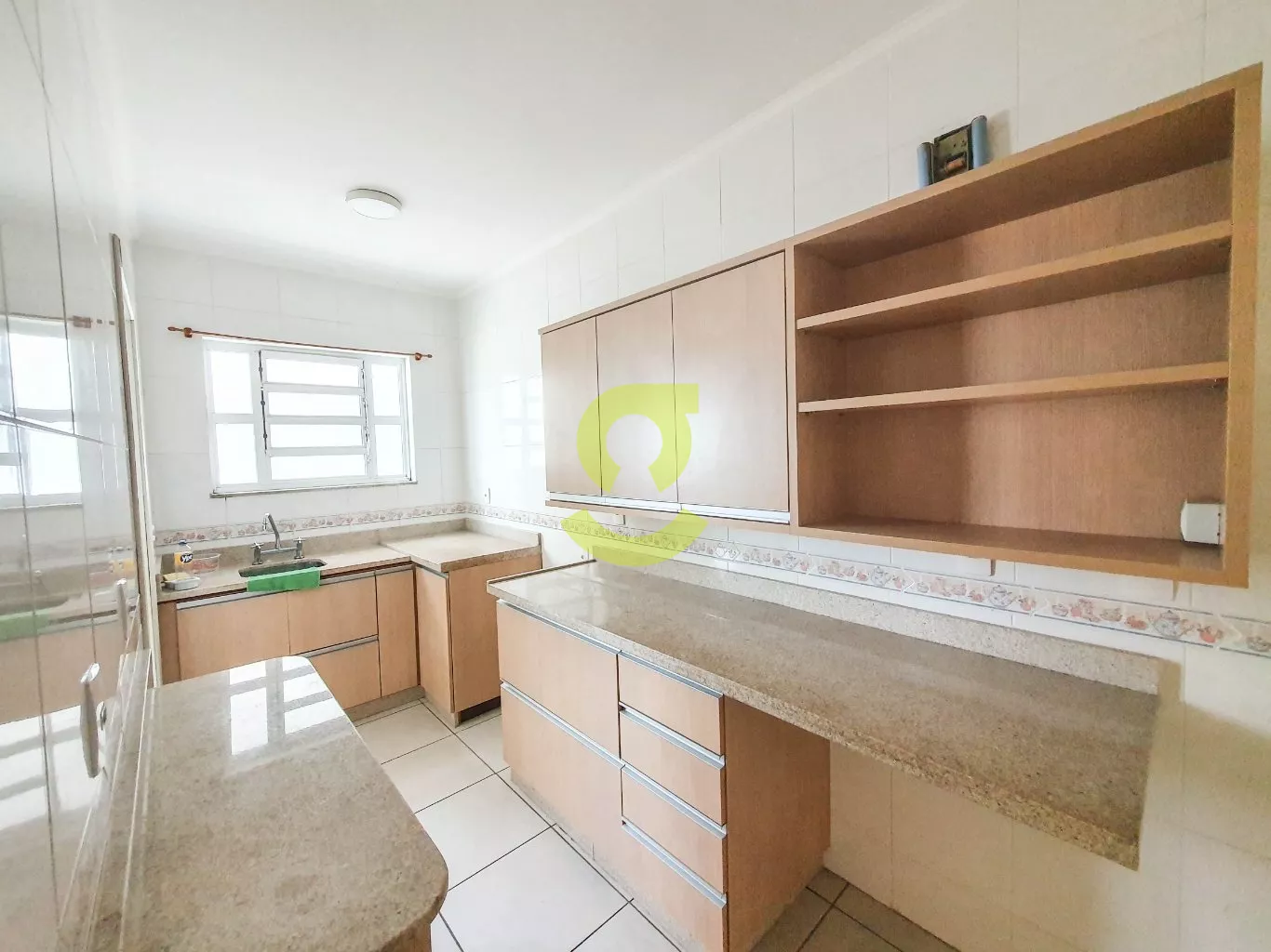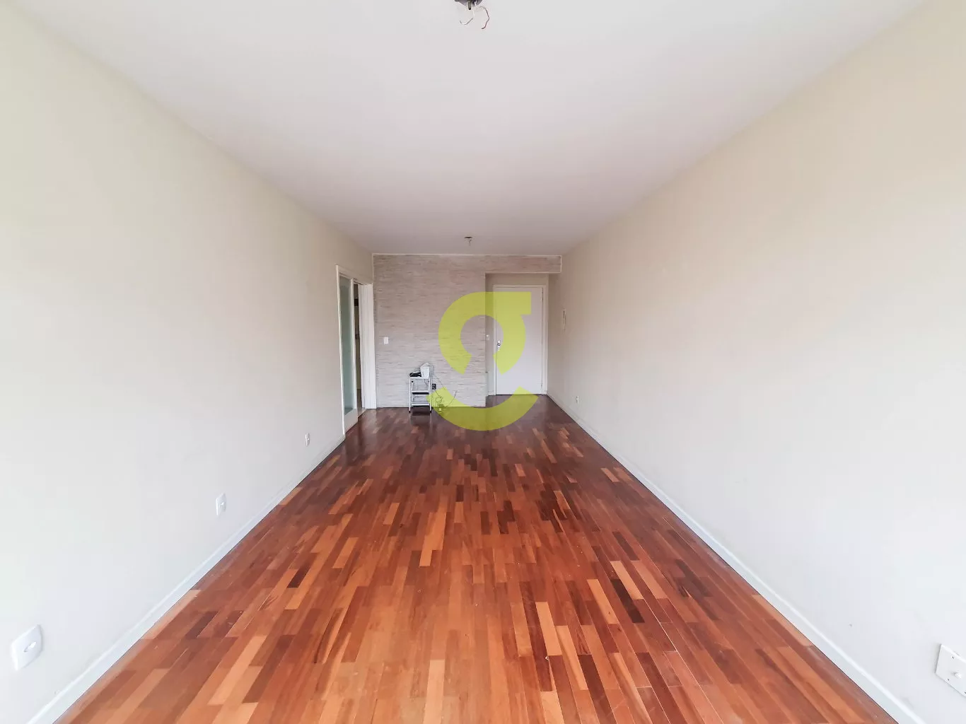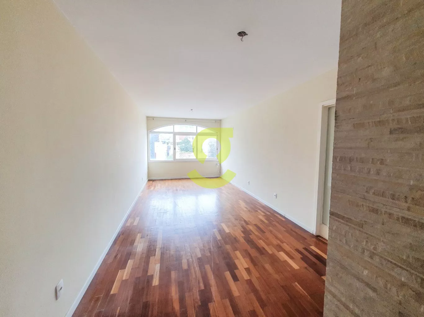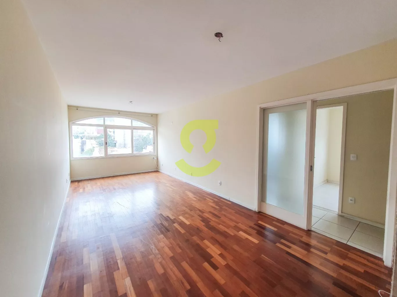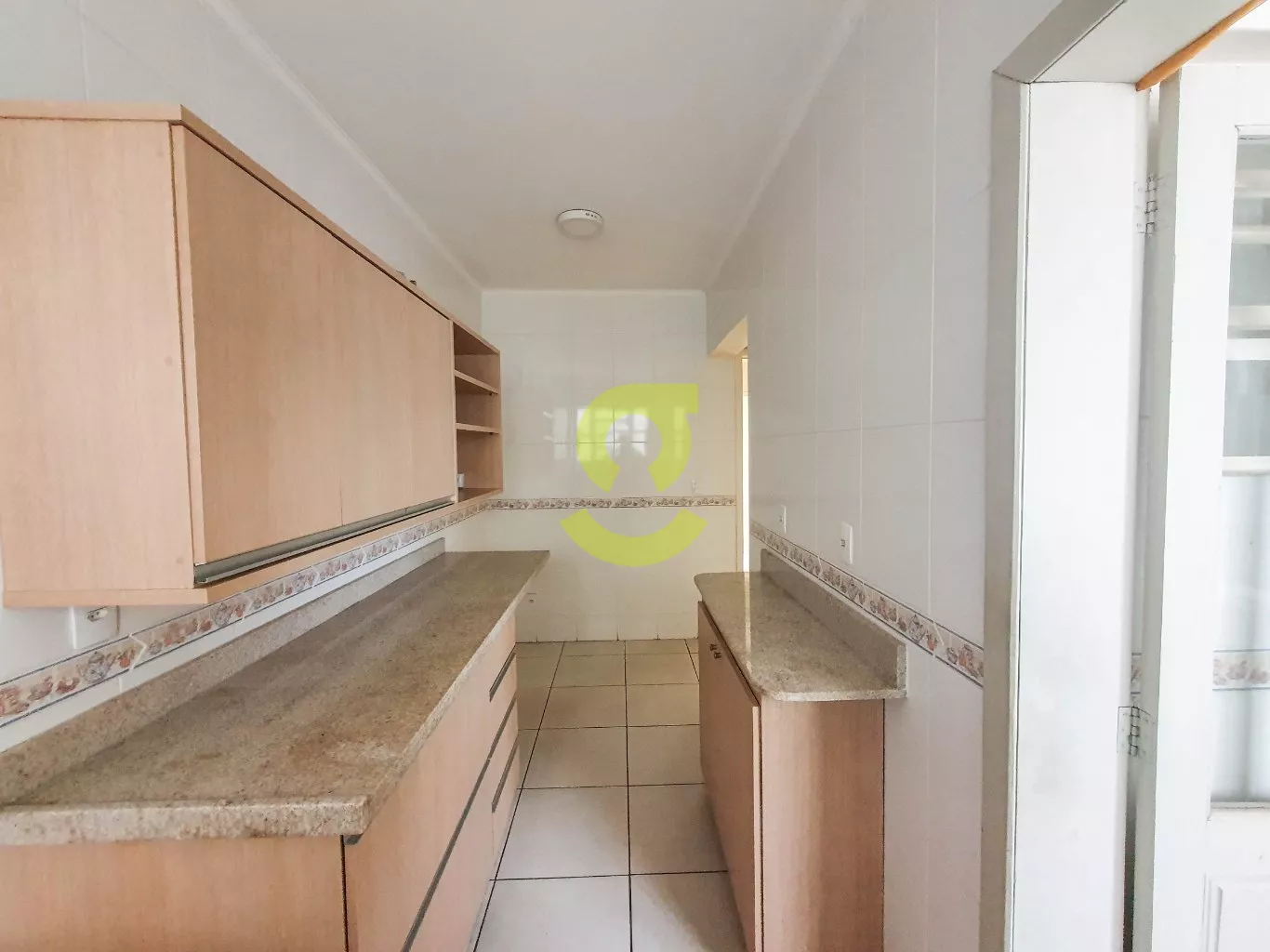 Apartamento de 82m², ampla janela na sala com uma bela vista, andar alto, cozinha com móveis fixos, área de serviço separada com dependência de empregada com banheiro social, 2 dormitórios e banheiro social com box de vidro entre os quartos.