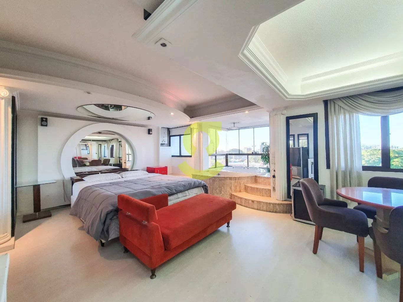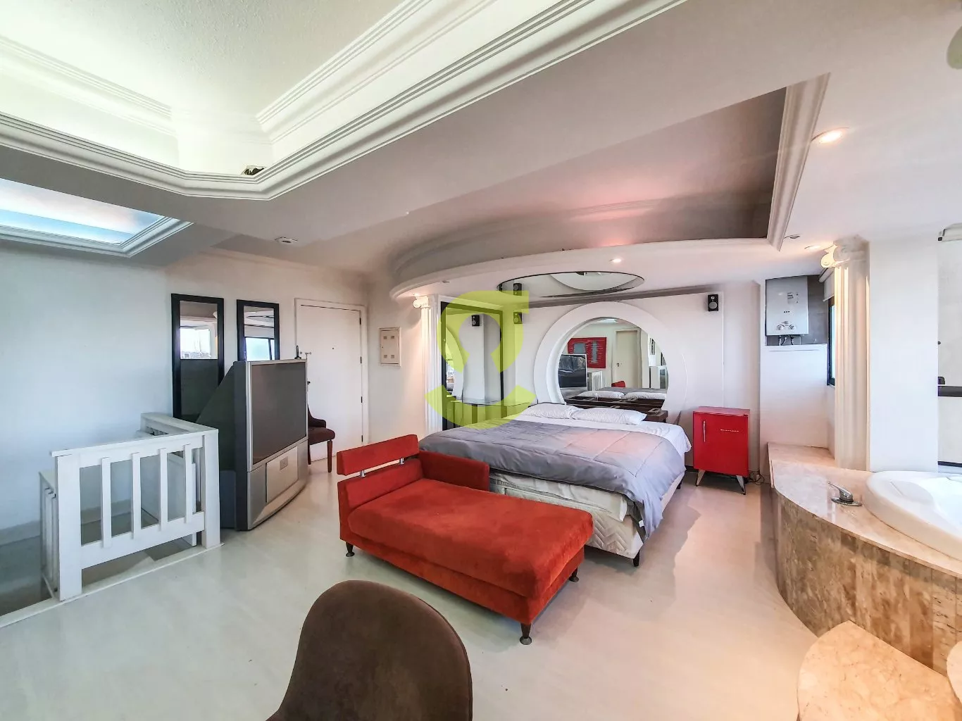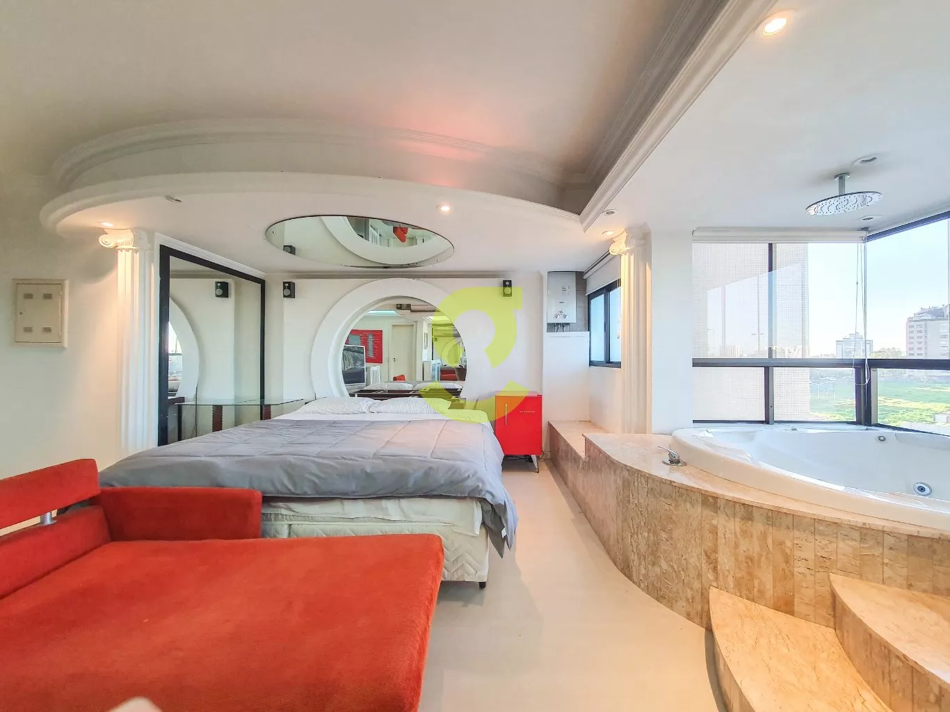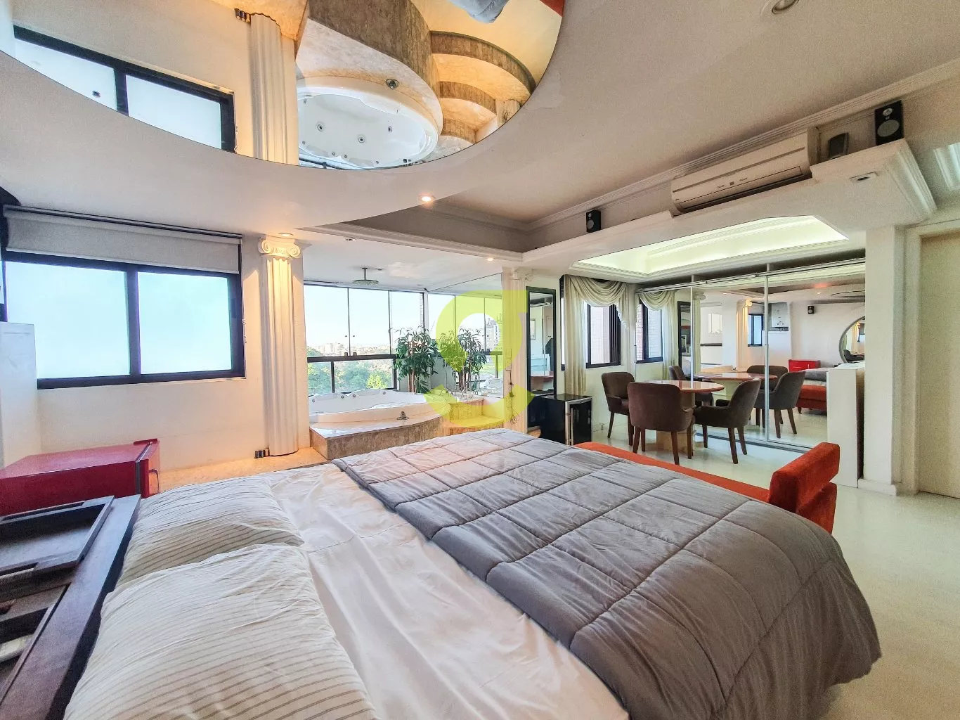 No segundo andar decoração e designe de cinema, cama com espelhos na cabeceira e no teto, aquecimento de passagem já instalado, linda Jacuzzi integrada a sacada, com uma vista incrível, 1 banheiro com, todo conforto que você precisa.