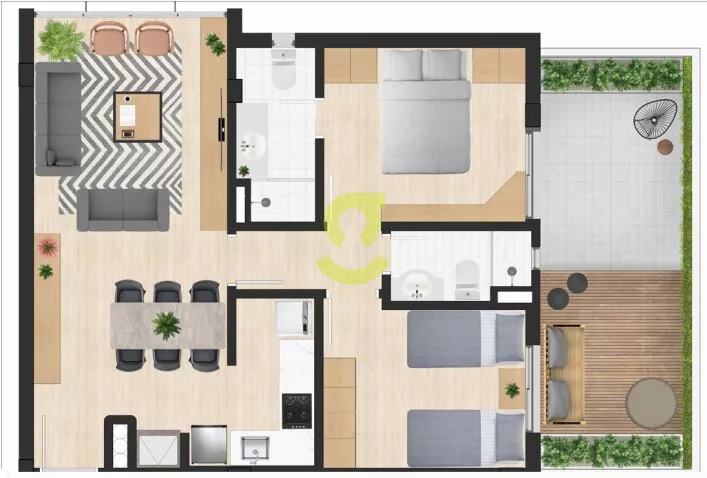 Apartamento GARDEN com 69m² de área privativa + 20m² de terraço garden, em um total de 89m², com 2 dormitórios com acesso ao garden, 1 suíte, 2 banheiros, churrasqueira e área de serviço e vaga coberta de garagem.