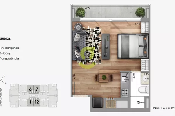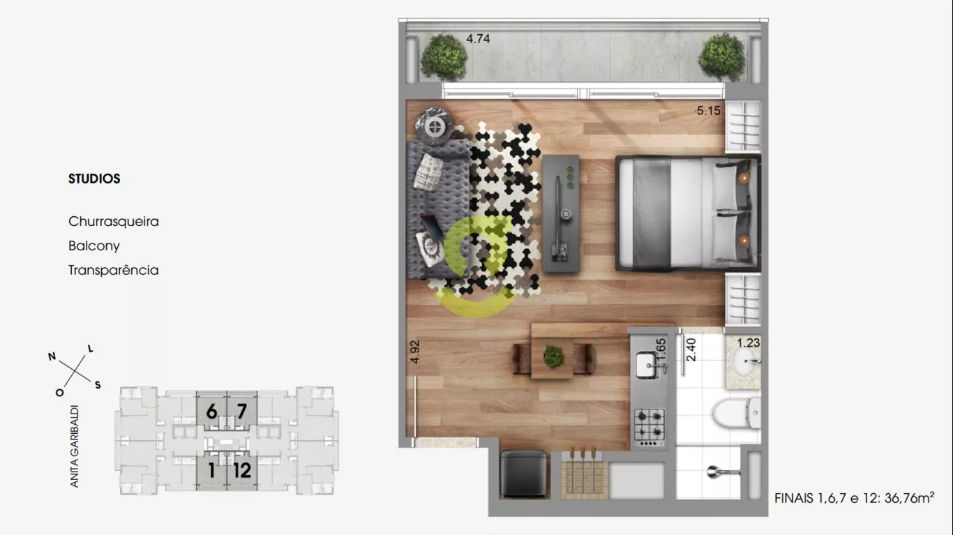 Global vende studio com 36,76m² de área privativa, churrasqueira na cozinha, possui manta acústica no piso dos apartamentos, espera de ar-condicionado split, fachada ventilada revestida com plaquetas de cerâmica que geram um conforto térmico maior, detalhes em aço e iluminação de LED padronizada em todas as sacadas. Com uma vaga de garagem escriturada. O Anita possui um lobby decorado, um espaço com living, lounge e gourmet, solarium e deck gourmet ao lado da piscina, que tem uma raia de 17m, lareira externa, fitness, espaço funcional, lavanderia, espaço zen e espaço pet. O empreendimento é pré-certificado pelo LEED (Leadership in Energy and Environmental Design), isso significa viver num lugar que foi projetado e construído pensando no mínimo impacto ambiental possível, apresentando eficiência e redução no consumo de água e energia.