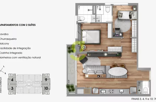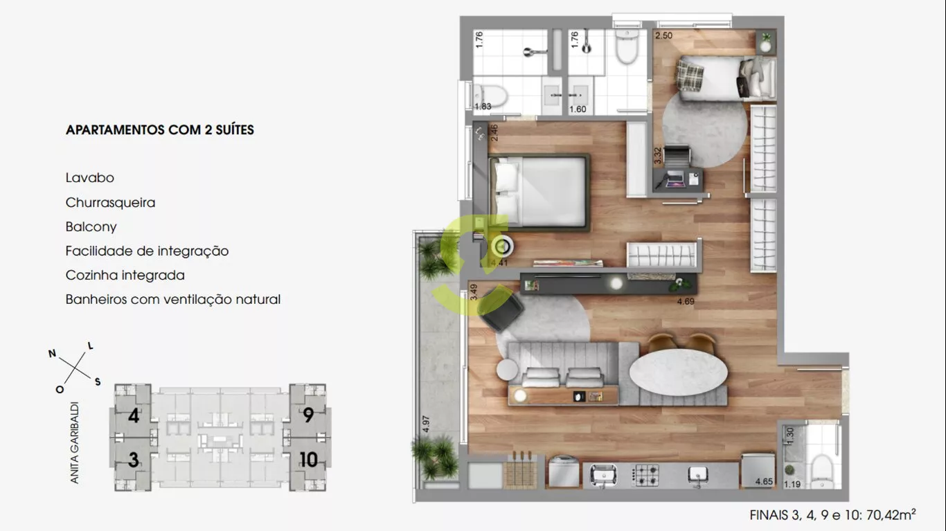 Apartamento com 70,42m² de área privativa, com 2 suítes, 1 lavabo e uma churrasqueira na cozinha, possui manta acústica no piso dos apartamentos, espera de ar-condicionado split, fachada ventilada revestida com plaquetas de cerâmica que geram um conforto térmico maior, detalhes em aço e iluminação de LED padronizada em todas as sacadas. Com uma vaga de garagem escriturada. O Anita possui um lobby decorado, um espaço com living, lounge e gourmet, solarium e deck gourmet ao lado da piscina, que tem uma raia de 17m, lareira externa, fitness, espaço funcional, lavanderia, espaço zen e espaço pet. O empreendimento é pré-certificado pelo LEED (Leadership in Energy and Environmental Design), isso significa viver num lugar que foi projetado e construído pensando no mínimo impacto ambiental possível, apresentando eficiência e redução no consumo de água e energia.